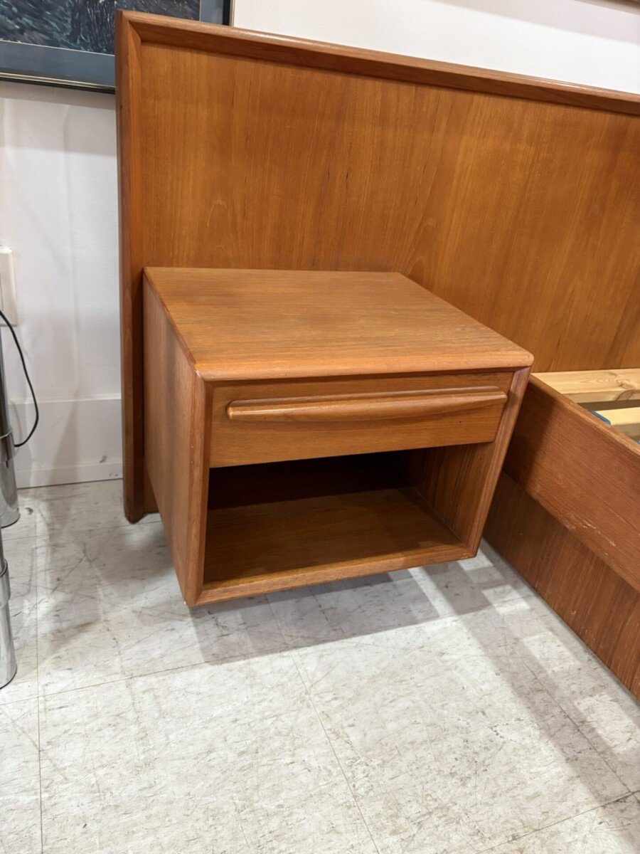 Teak queen size platform bed featuring floating night tables with an additional storage area below. This piece will be cleaned and oiled.