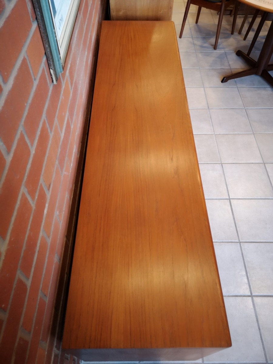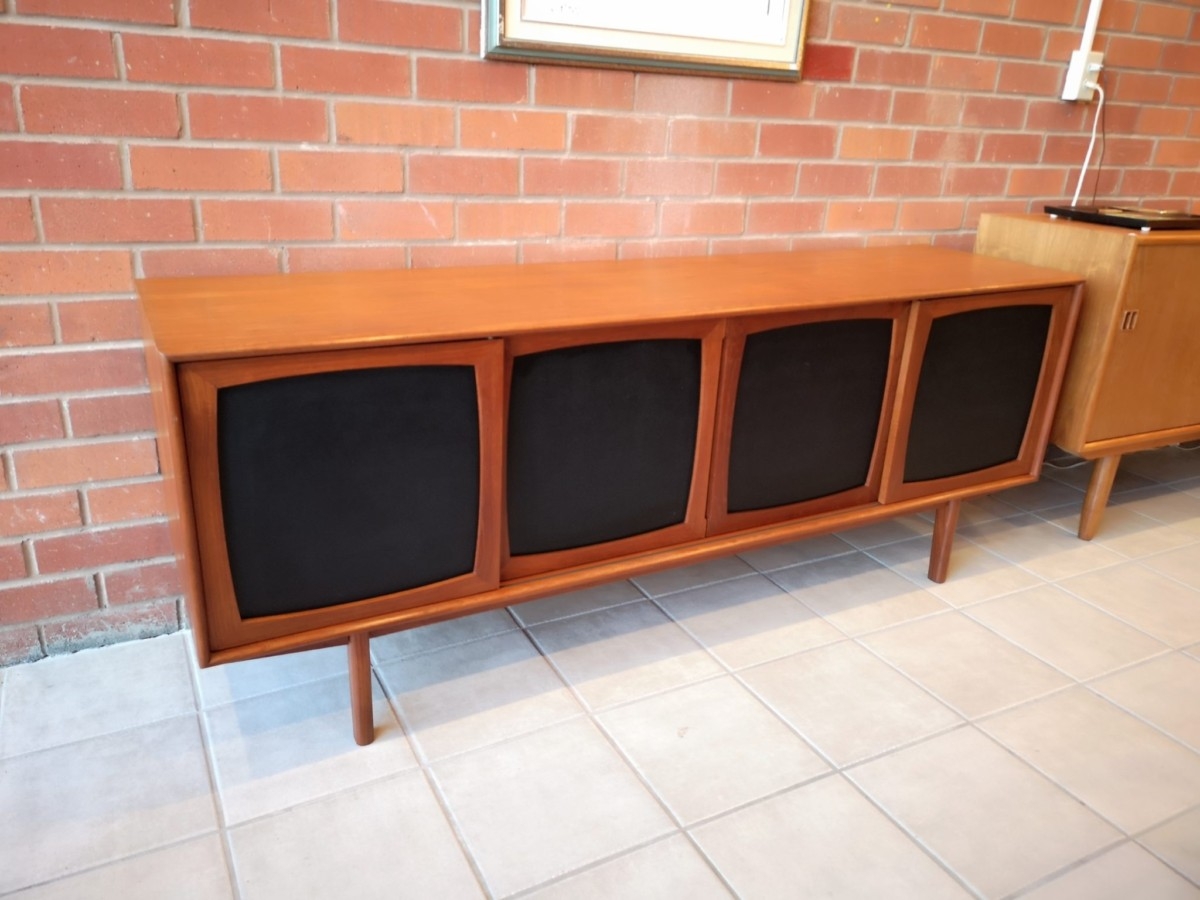 Teak buffet featuring 4 sliding doors with black vinyl inset, 2 adjustable shelves, and 4 drawers.