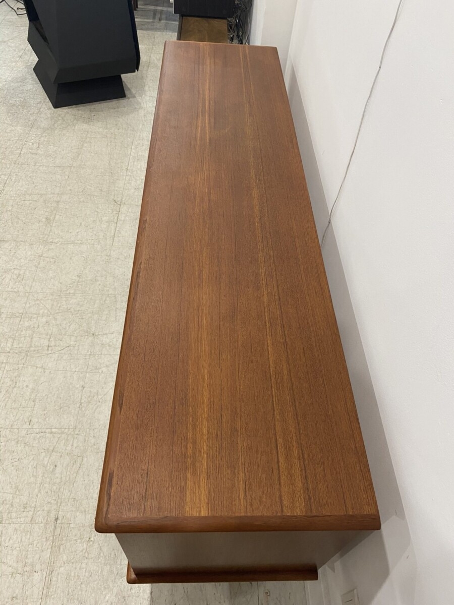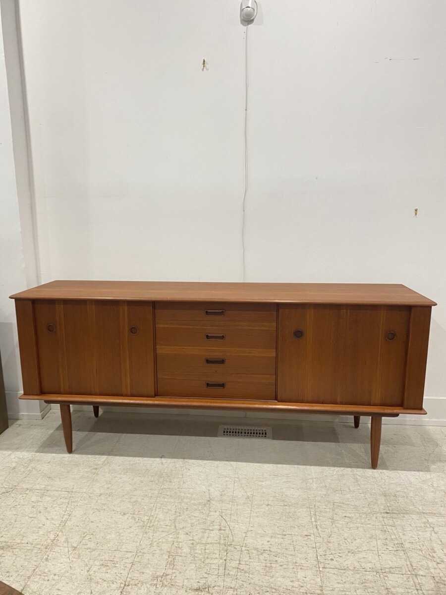 Teak buffet by Huber and Co. Model 274. This piece features 2 sliding doors, 4 drawers and 2 adjustable shelves.(minor watermarks on the top).