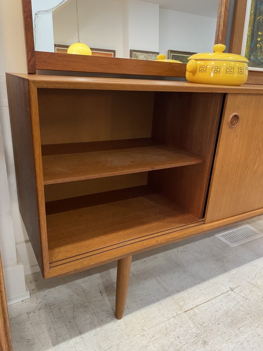 We just received this teak buffet. It features 3 sliding doors, 2 drawers and 2 adjustable shelves. Although it looks great, it will be cleaned and oiled.