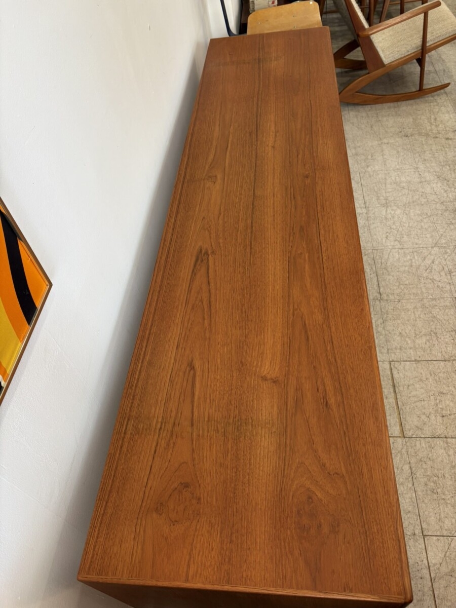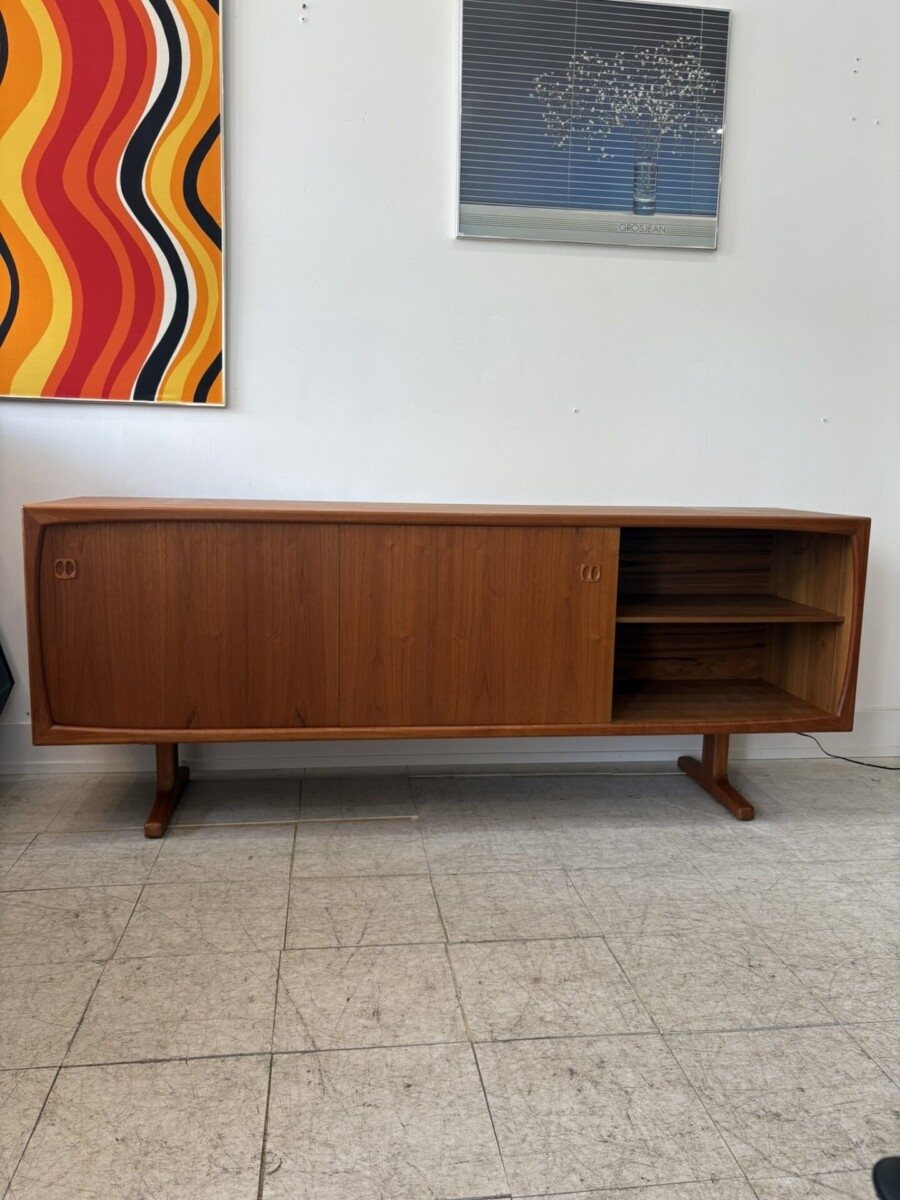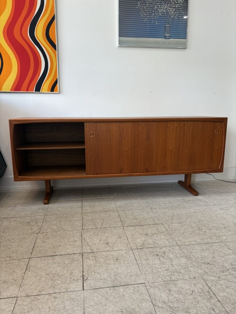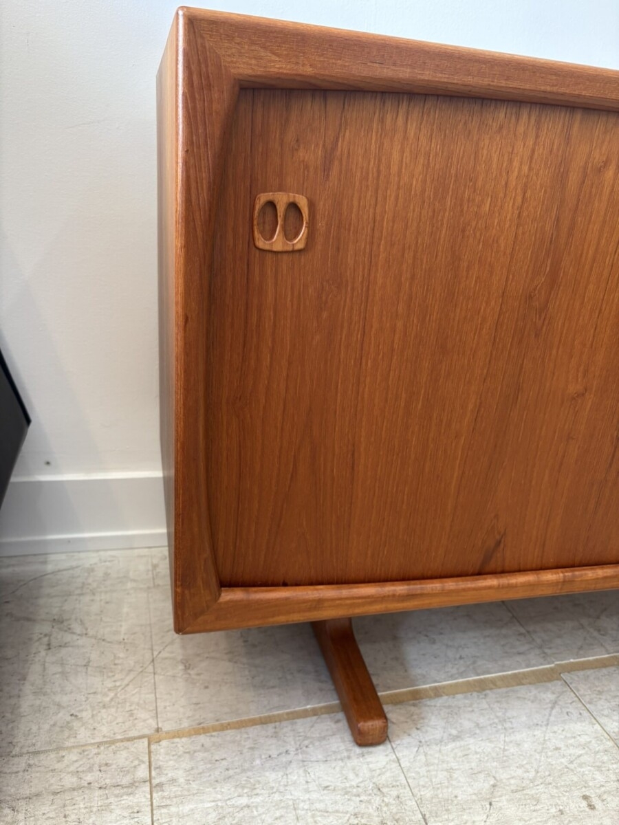 Danish teak buffet featuring 2 sliding doors, 4 drawers, and 2 adjustable shelves. This piece also has a beautiful front trim and leg design. (Slight darker areas on the top where a hutch was placed)