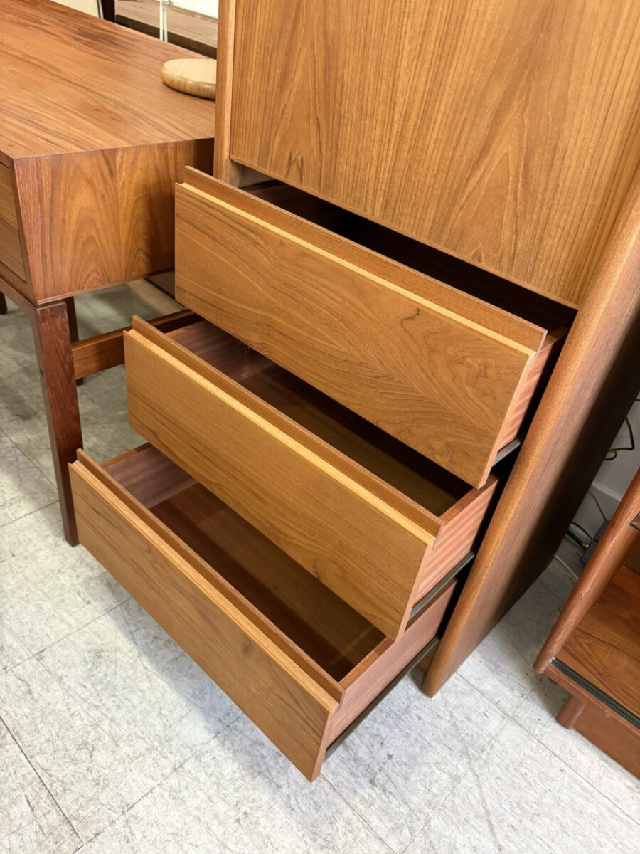 Teak cabinet featuring a swing out door, 3 drawers and 2 adjustable shelves.  2 available.  $550 each