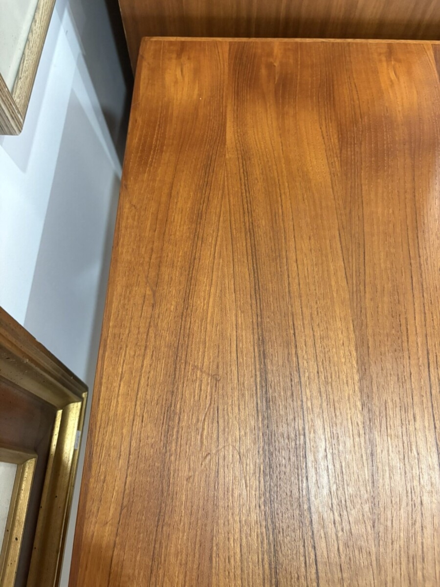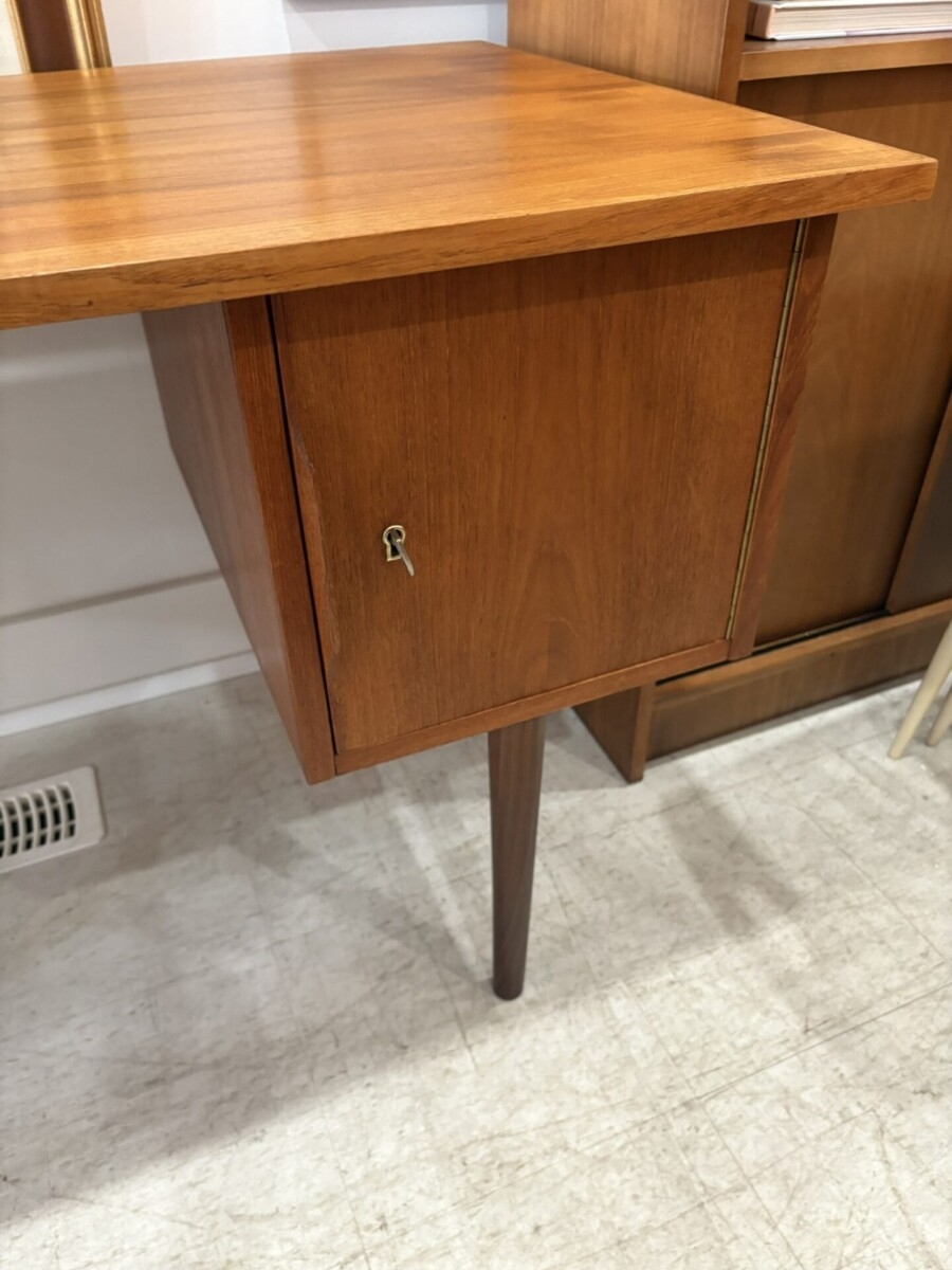 Teak desk featuring 3 drawers and a lockable storage area.(includes key)(mark on the top- last photo).