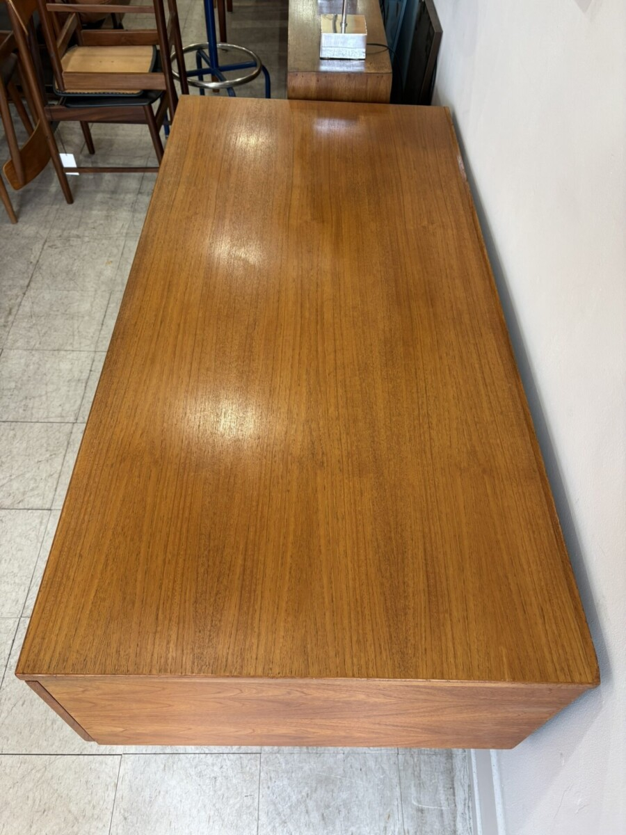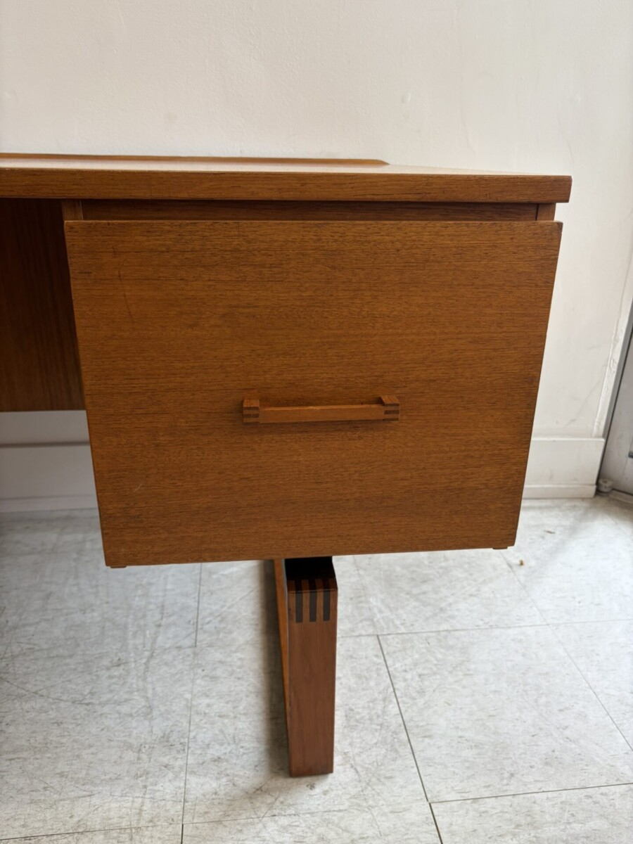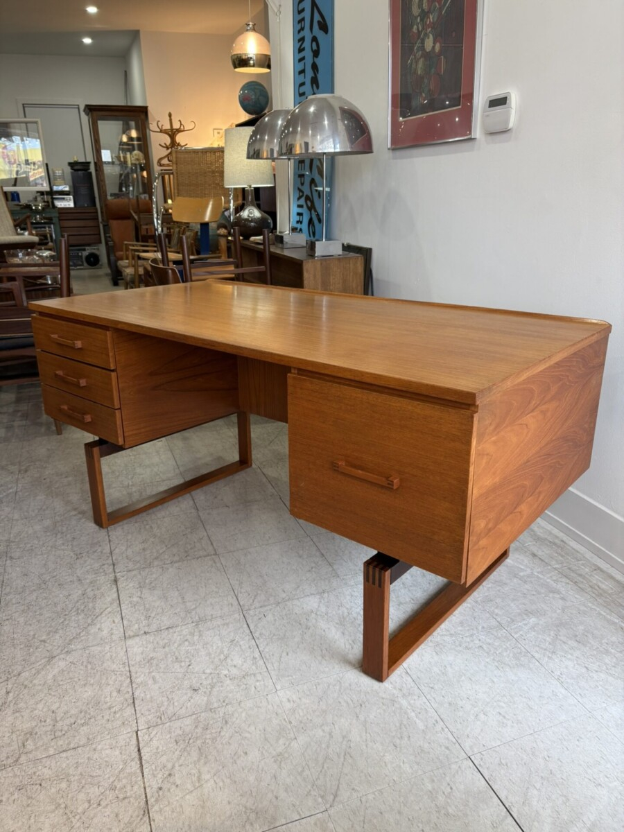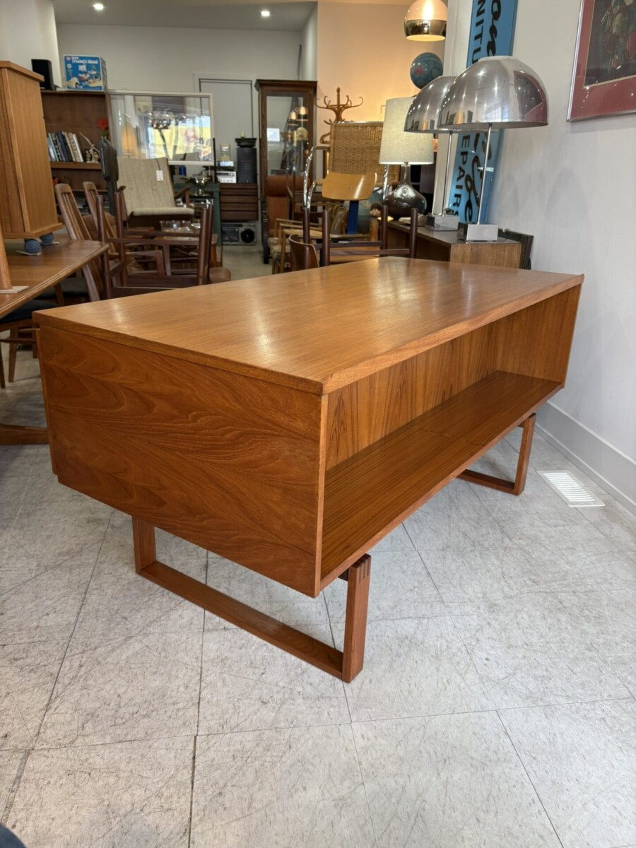 Drylund Danish executive teak desk designed by Henning Jensen and Torben Valeur in the 1960s. This piece features a finger joint elements in the construction of the legs and drawer pull. It features 3 drawers, a file drawer and additional storage on the back side.