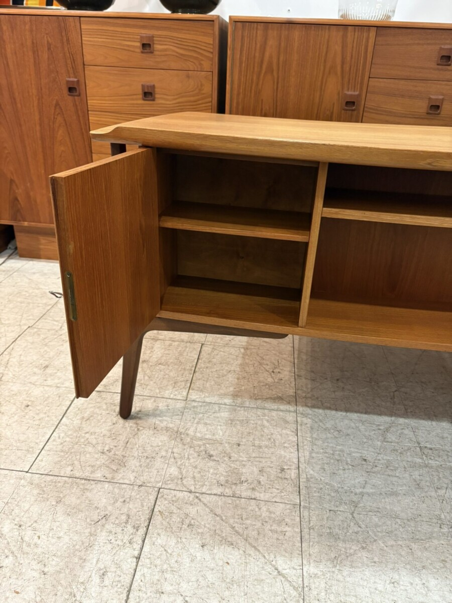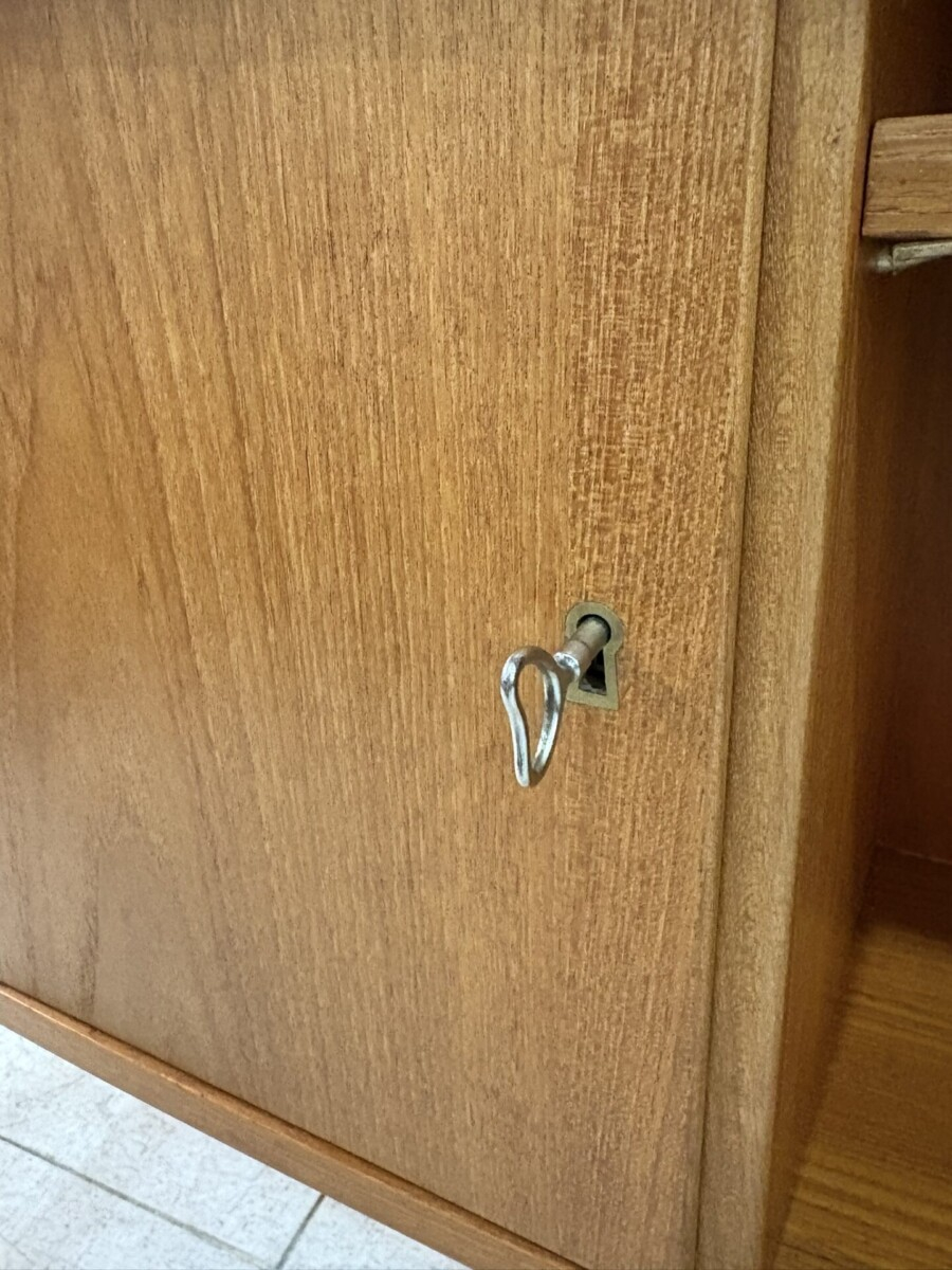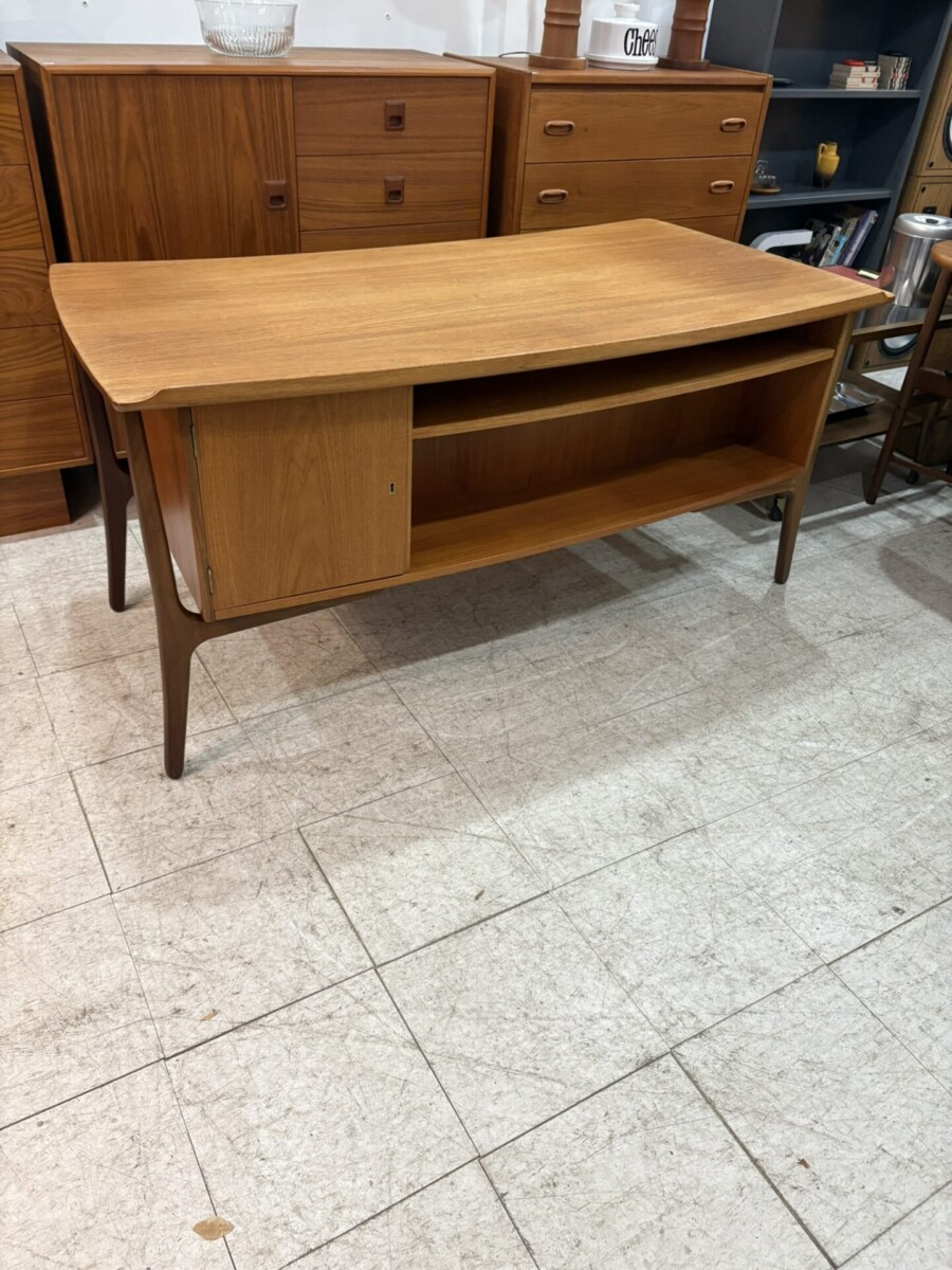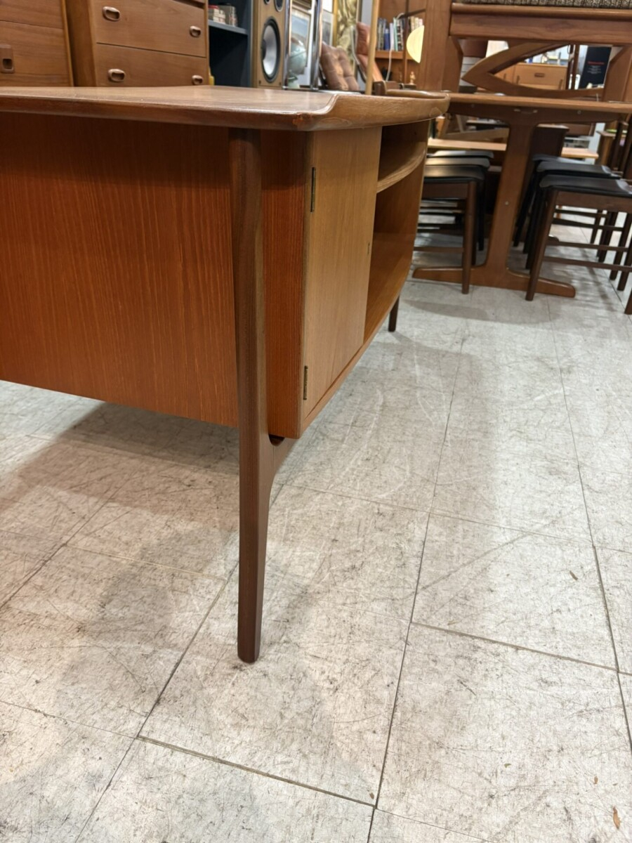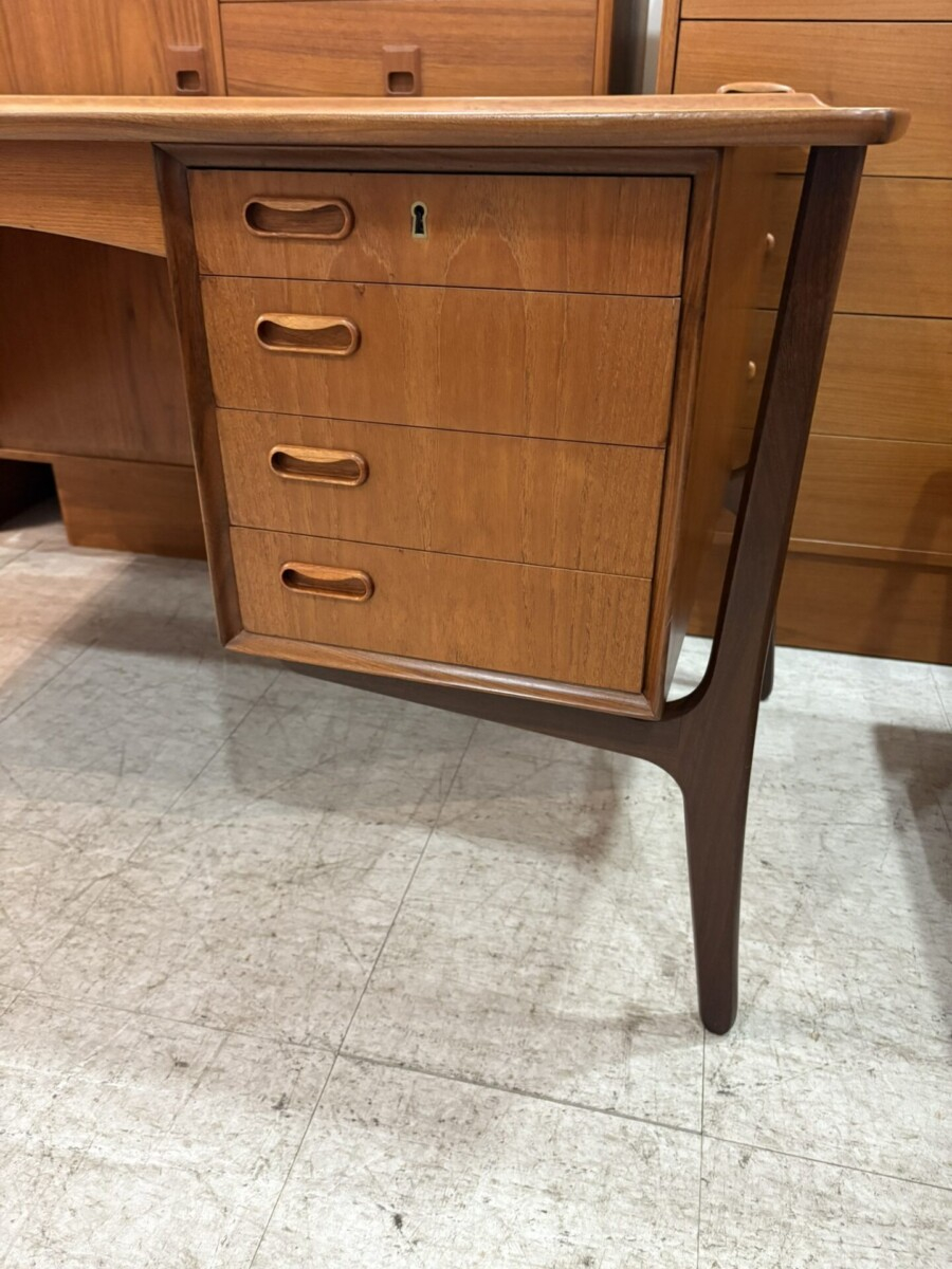 Danish teak desk by H. P. Hansen for Svend A. Madsen. This piece features 8 drawers, a locking cabinet with a shelf, additional front storage with a shelf and a beautiful leg design.
