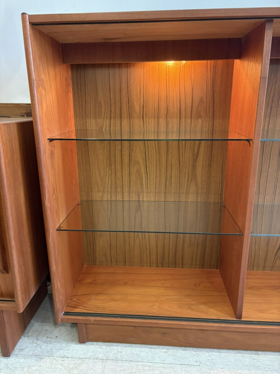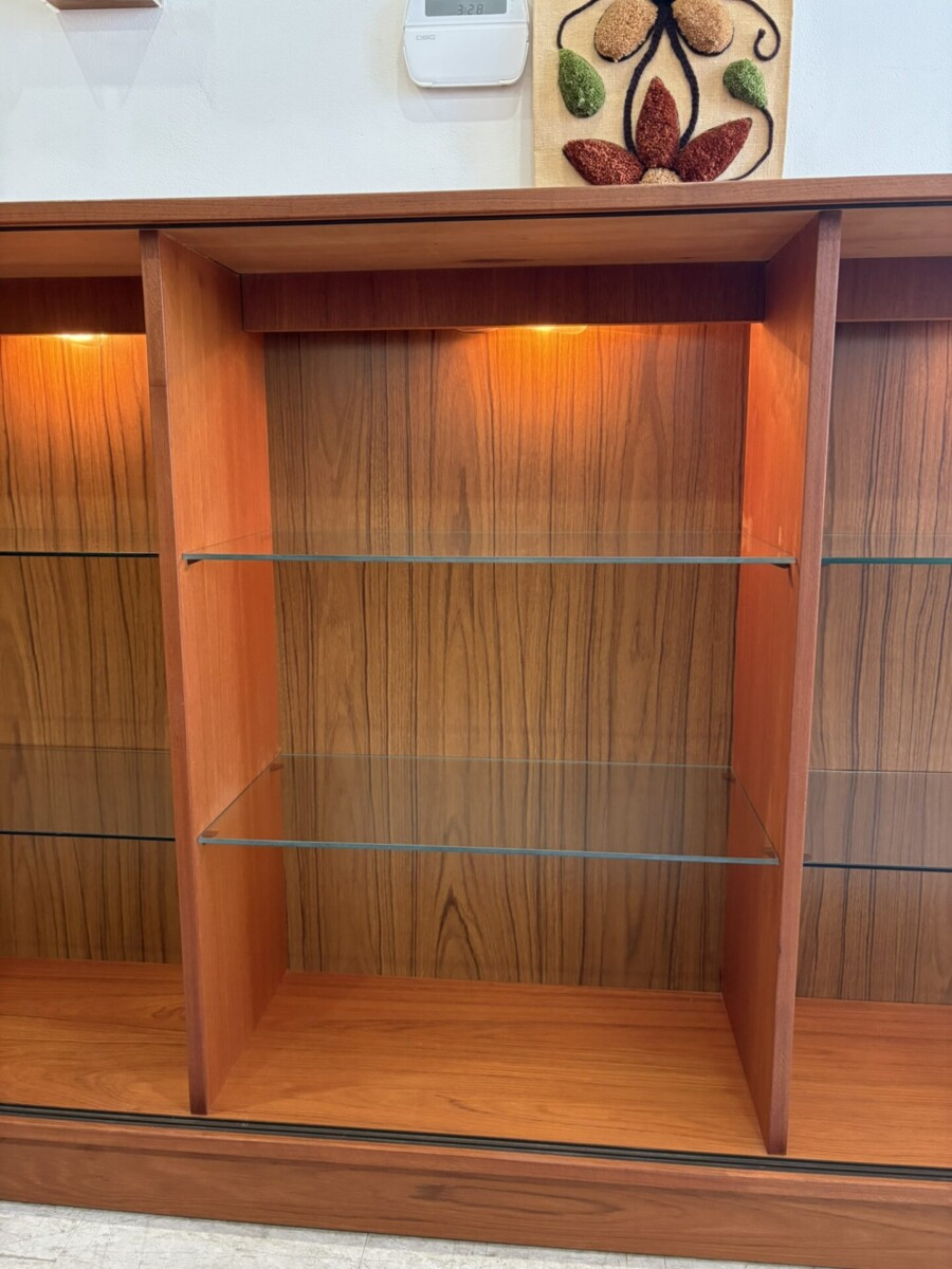 Teak display unit featuring 6 glass shelves(they can be removed, but are not adjustable) and 3 lights.