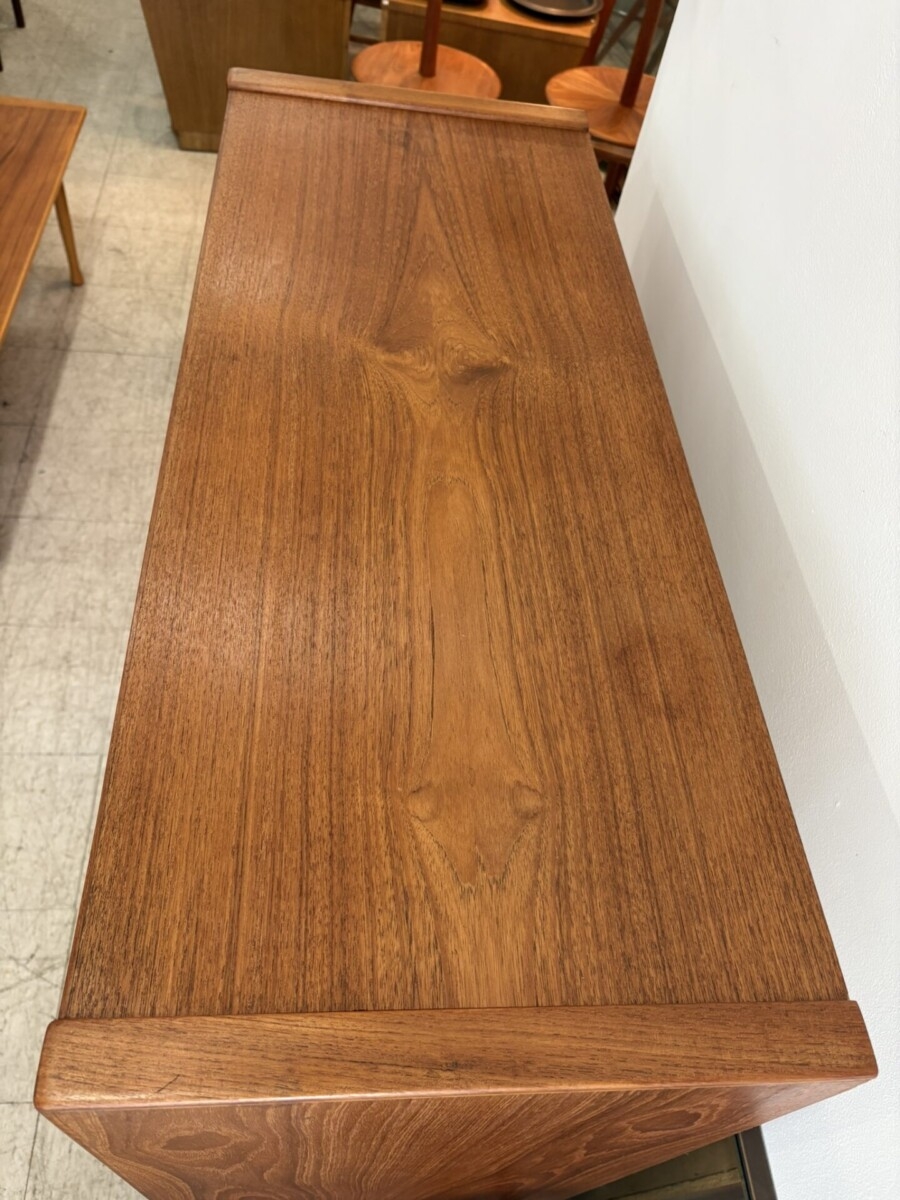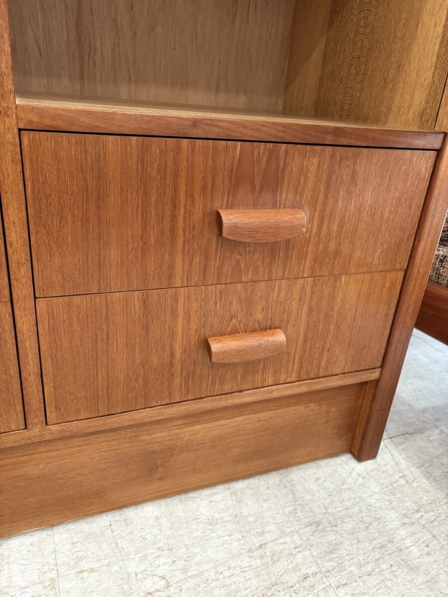 We just received this teak tall dresser which features 2 swing out doors, 2 shelves and 4 drawers.(very slight water mark on top). This piece will be cleaned and oiled.