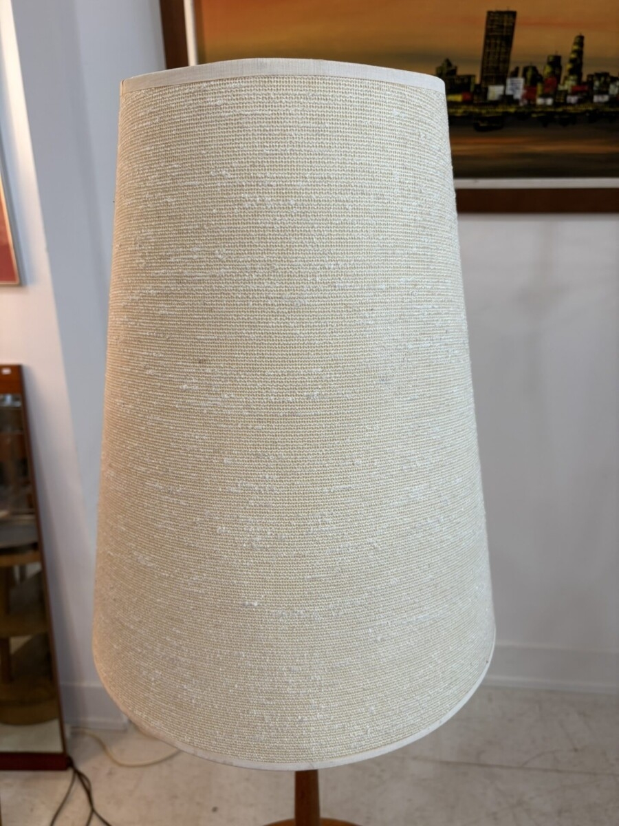 Teak floor lamp featuring an integrated table design and original shade.