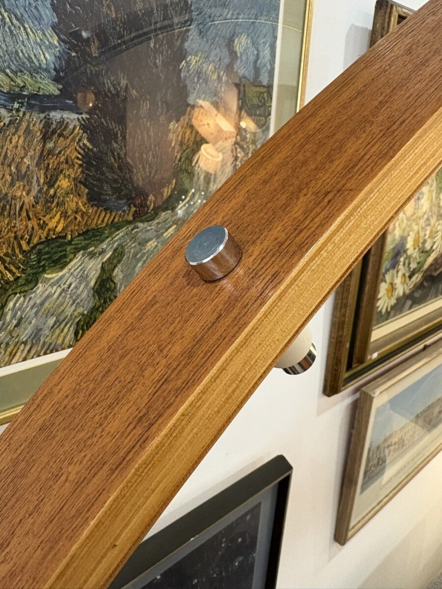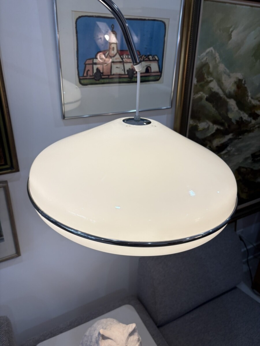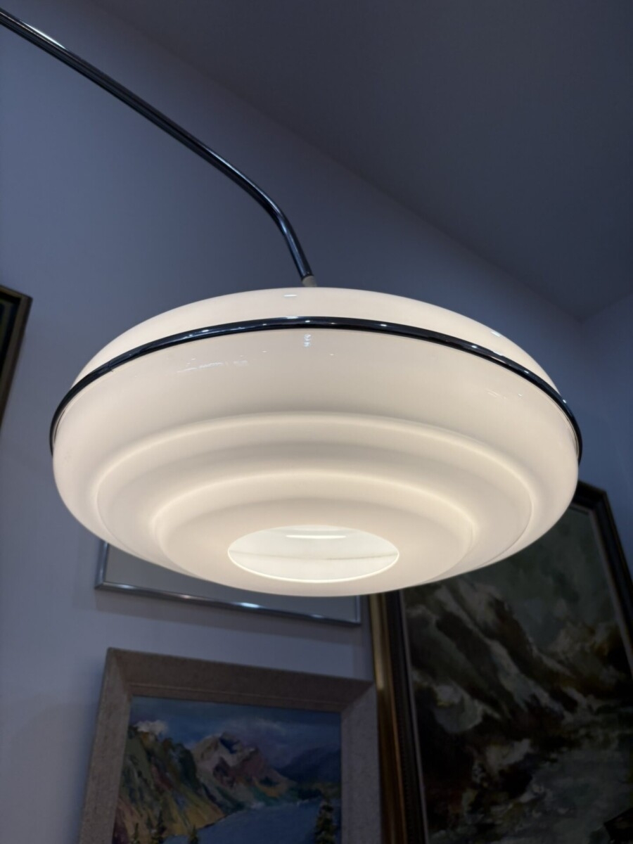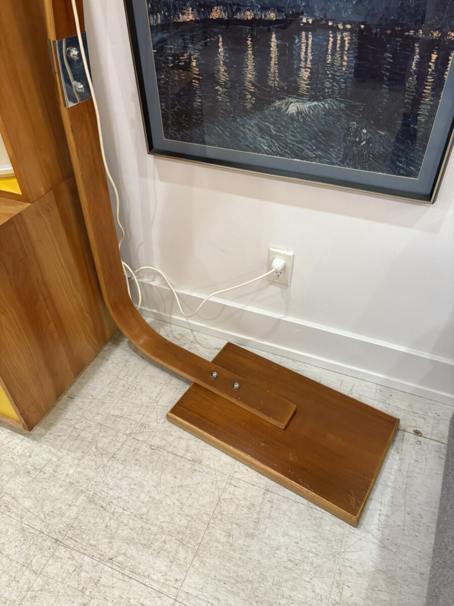 Arc floor lamp with a mix of chrome, lucite and teak components.