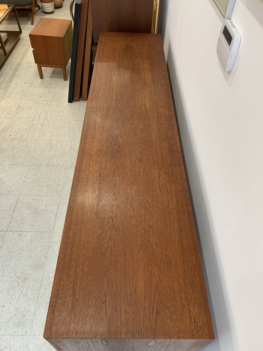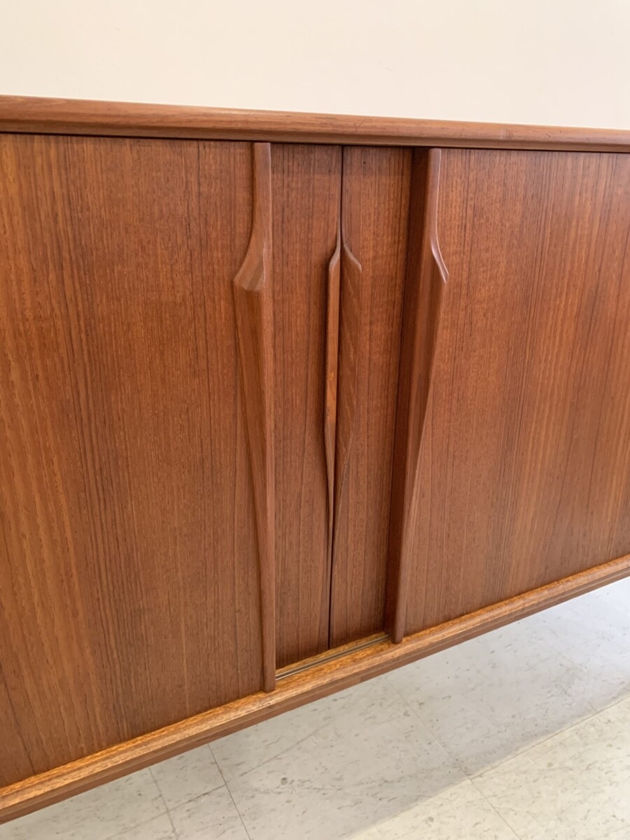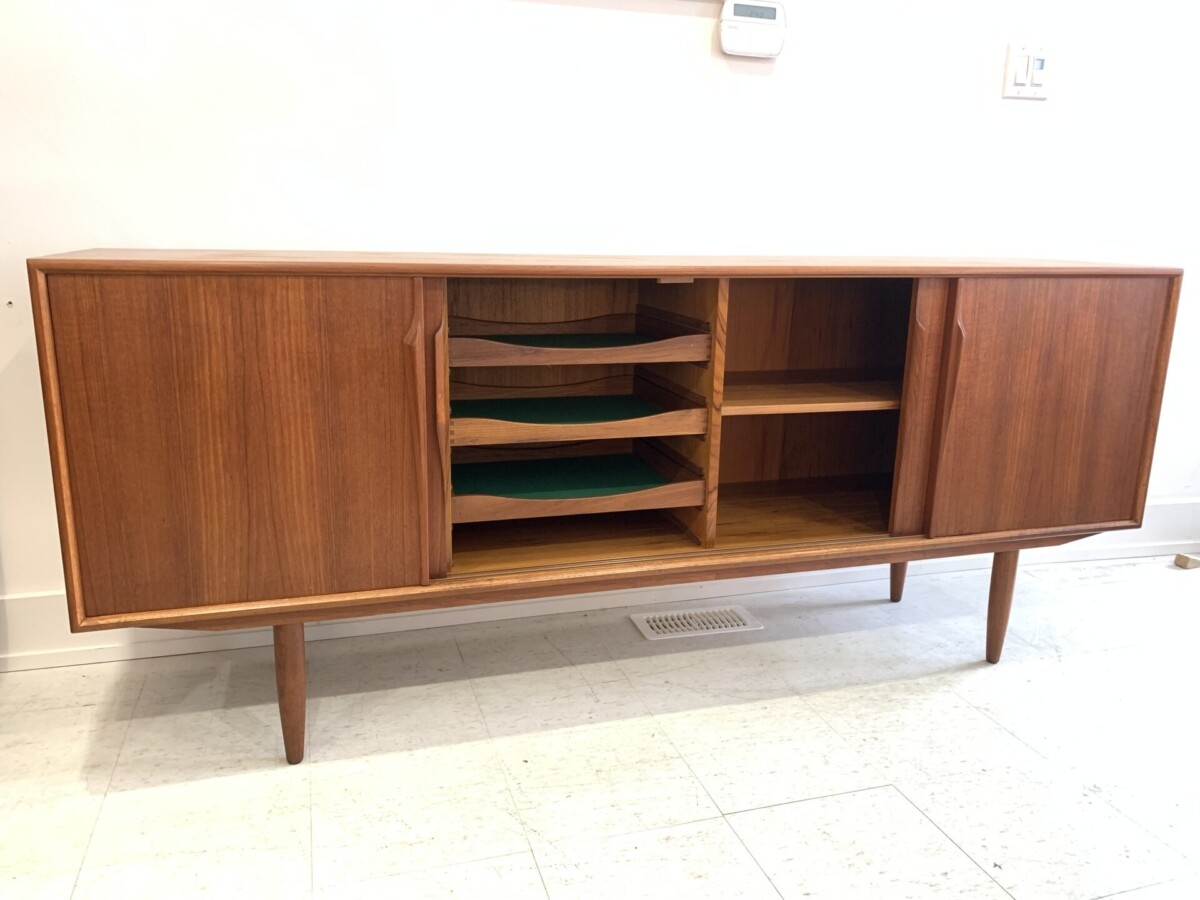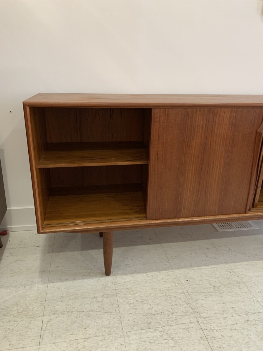 Mid century Danish teak sideboard was designed by Axel Christensen for ACO Møbler. This piece features 4 sliding doors, 2 adjustable shelves and 3 felt lined drawers(some slight water marks on the top).