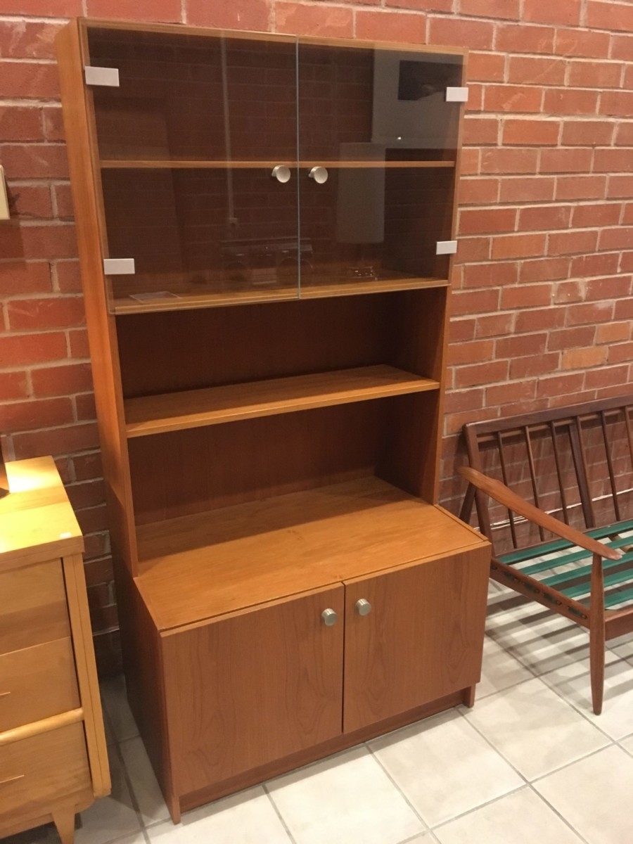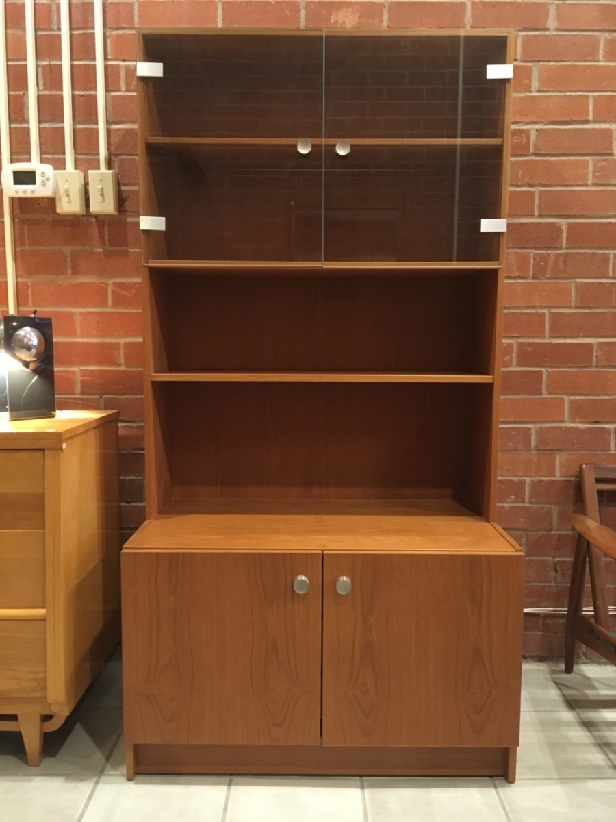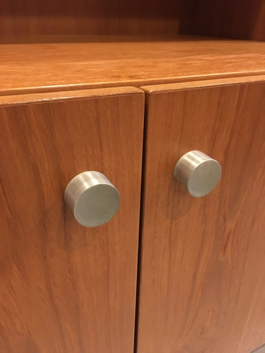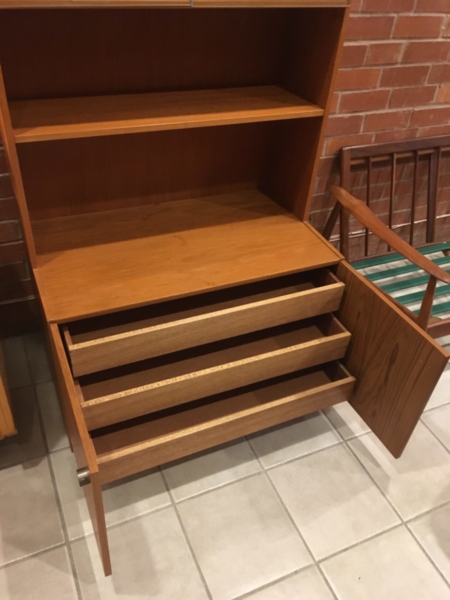 Danish teak unit featuring a top section with glass swing out doors and an adjustable shelf. Also the lower section features swing out doors and 3 drawers. The hardware is both aluminum and stainless steel.